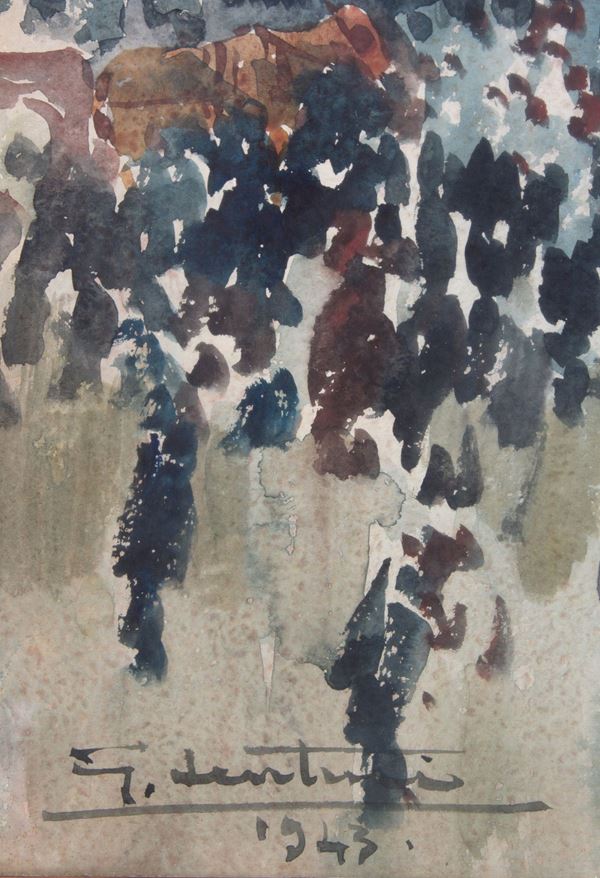 Watercolor on paper depicting "CROWD IN THE SQUARE". Signed and dated 1943 lower left. In frame.