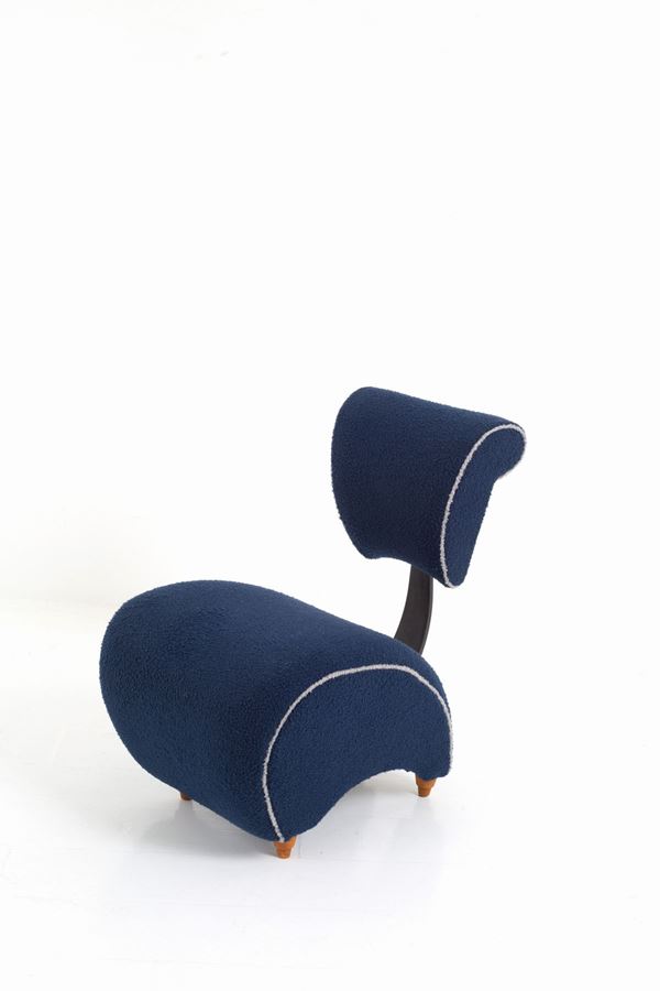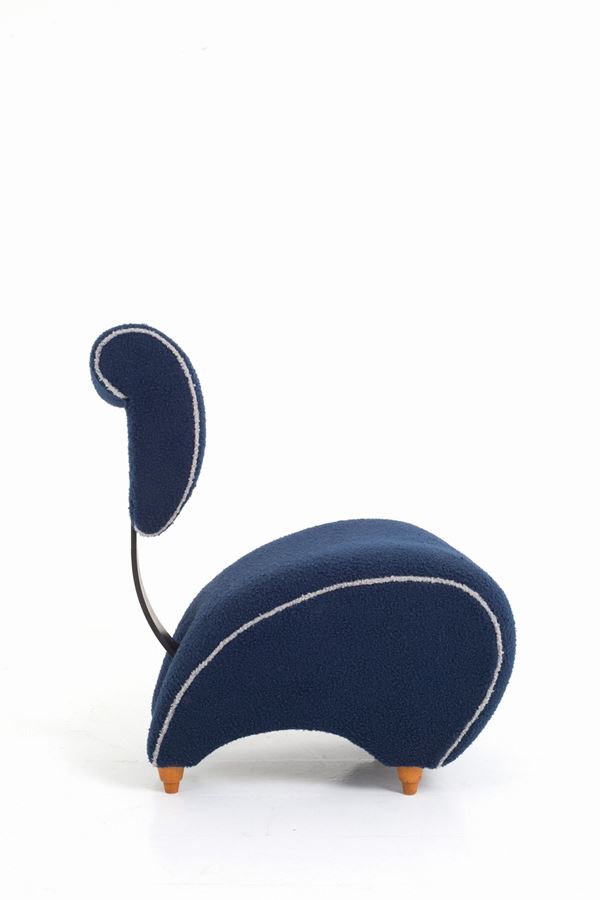 Armchair with painted iron structure covered in blue bouclé wool with gray profiles. 80s. Reupholstered.
