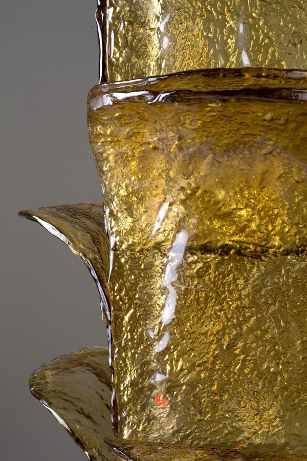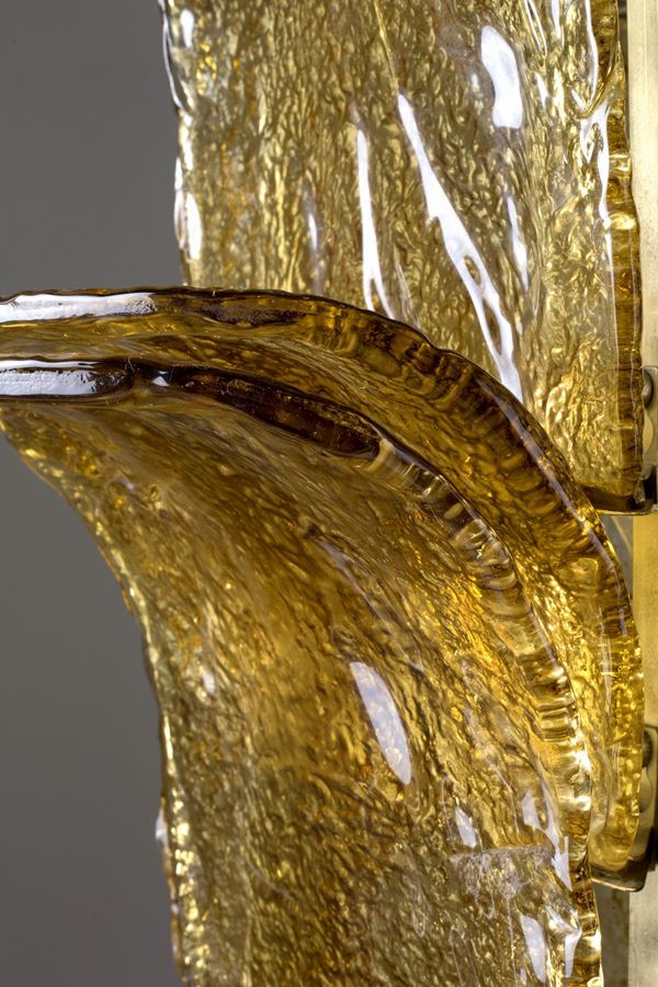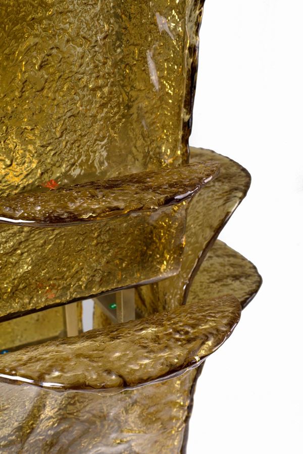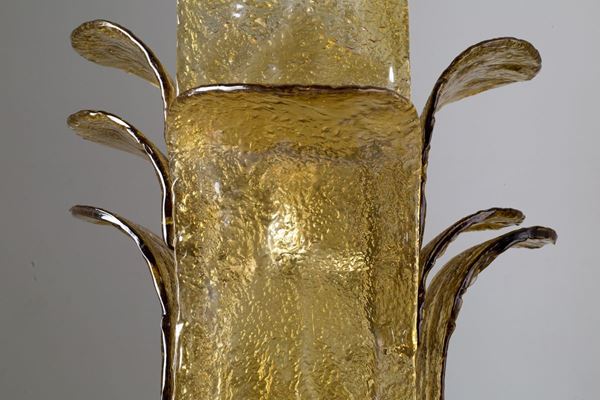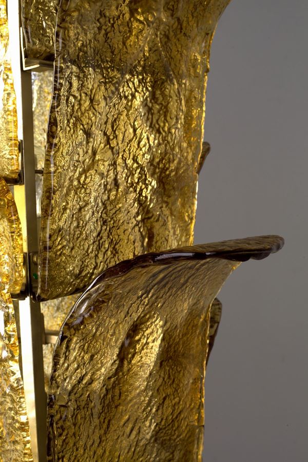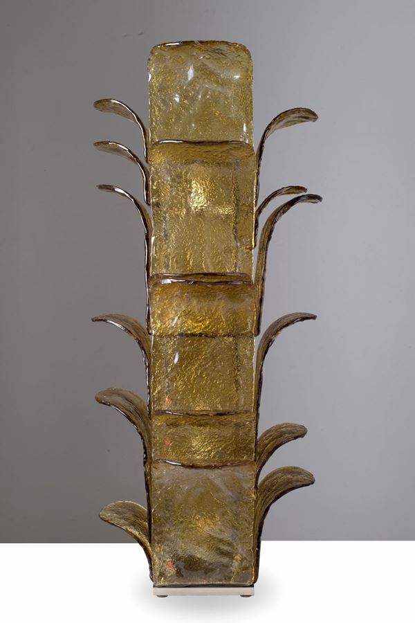 Floor lamp model LT320, called Cactus, with four lights, in satin metal and amber-coloured curved Murano glass leaves. MAZZEGA production. 70's. Signs of wear and tear on one leaf.
