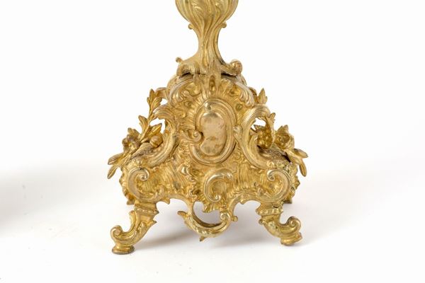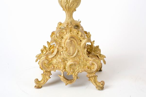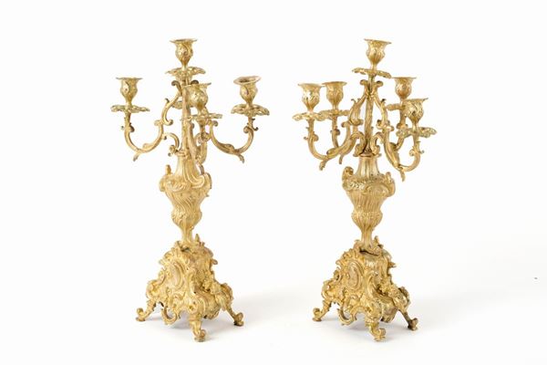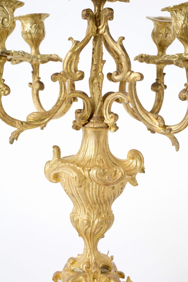 Pair of five-flame candelabra in chiseled and gilded bronze. Late 19th-early 20th century.