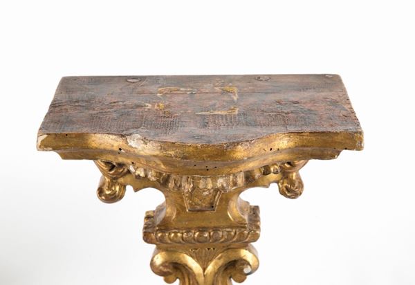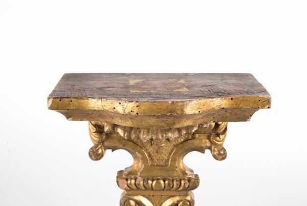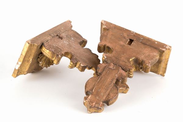 Pair of carved and gilded wooden shelves with faux marble lacquered top. 19th century. Defects.