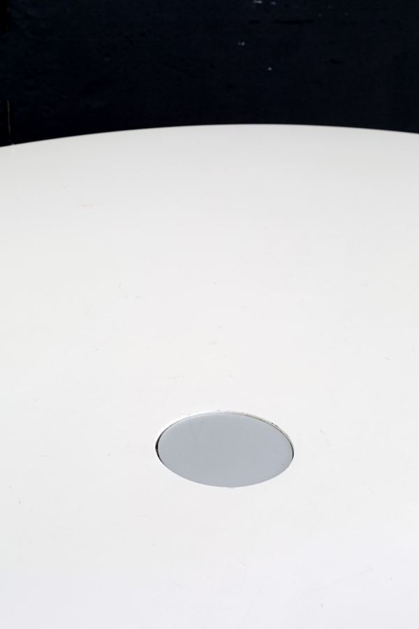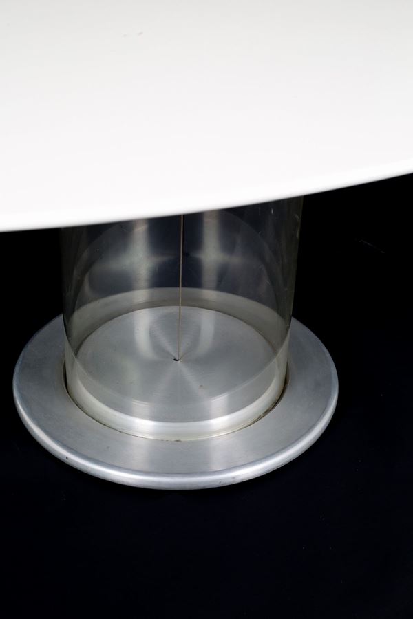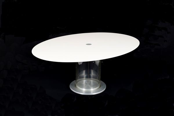 Ellisse table with plexiglass support, chromed metal base and white lacquered wooden top. SORMANI production. 70's. Signs of wear over time.