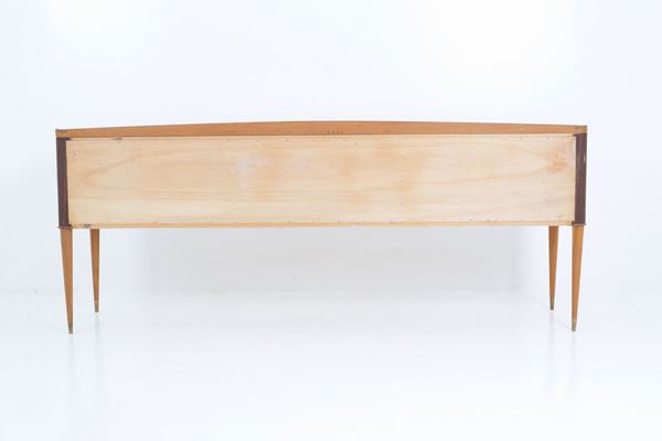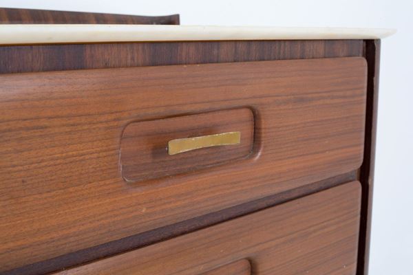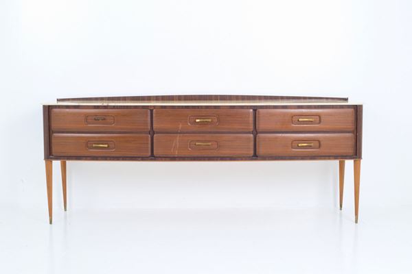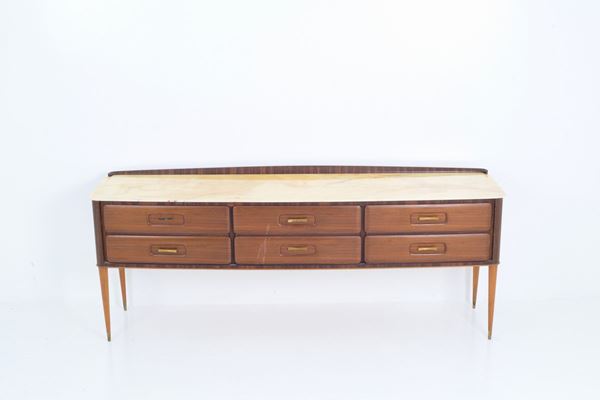 Sideboard with six drawers in various woods with brass handles and tips and onyx top. 60's. Defects and shortcomings.