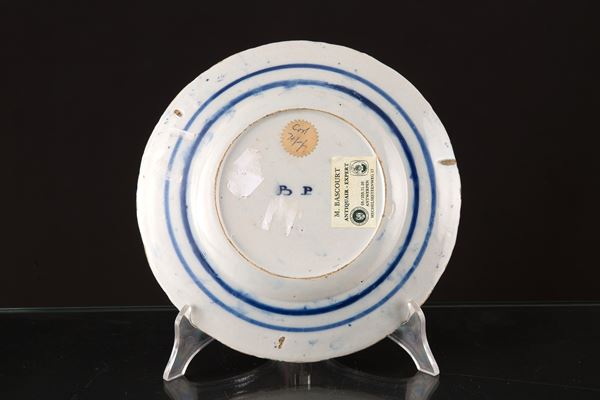 Slightly polylobed plate in white and blue porcelain. Manufacture Netherlands. Marked BP under the base. 19th century. Defects.