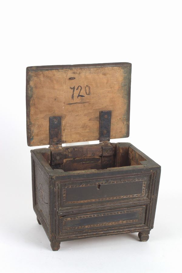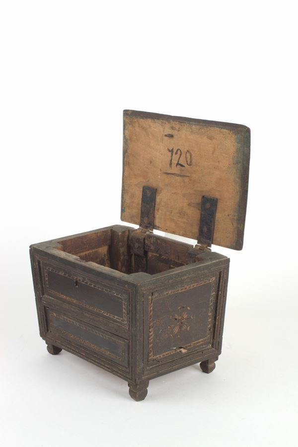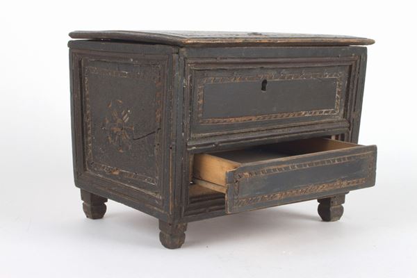 Stained wooden box carved with geometric motifs with a drawer on the front. Late 16th century. Defects.