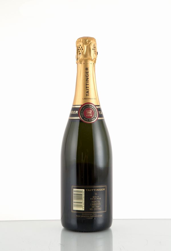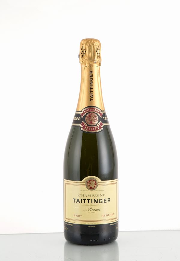 A bottle of Taittinger Champagne Brut Réserve. Original box set.