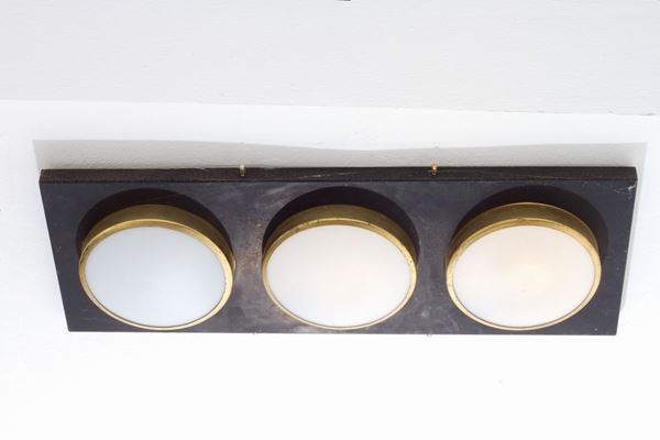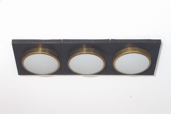 Three ceiling lights with three spotlights in black painted iron, brass and milk glass. 80s. Defects and signs of wear over time. Missing one back cover.