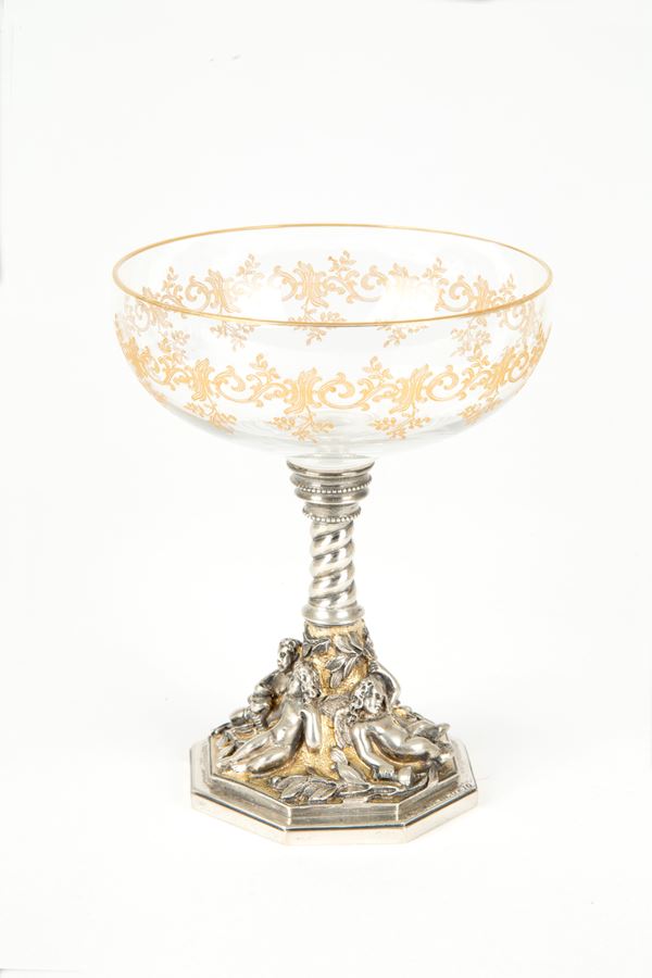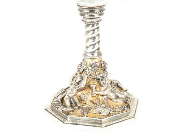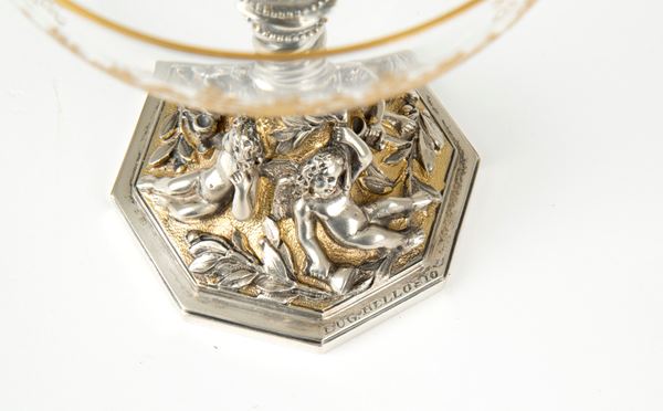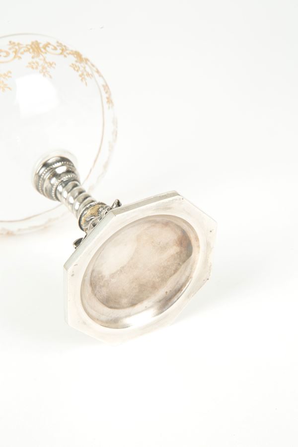 Twelve crystal cups with finely embossed and chiseled silver base. Signed on the bases.
