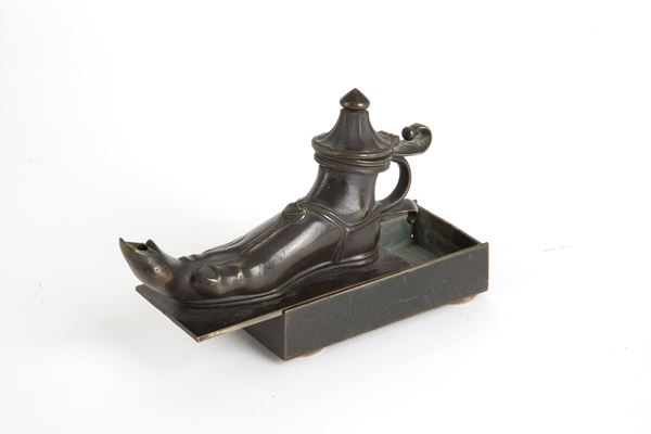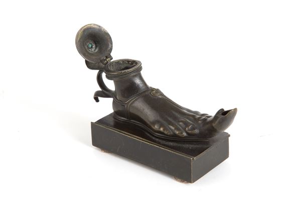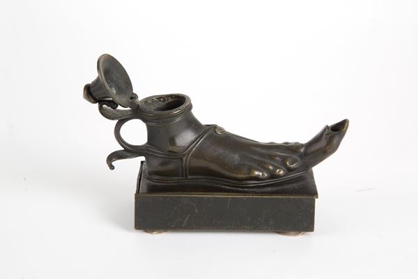 Foot-shaped patinated bronze oil lamp mounted on bronze box. 19th century.