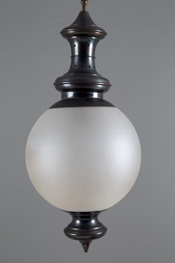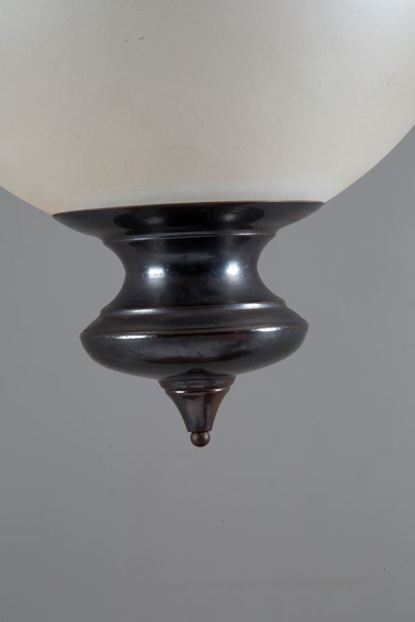 Suspension chandelier in satin brass and opaque glass. AZUCENA production. 60s-70s. Signs of wear and tear of time.