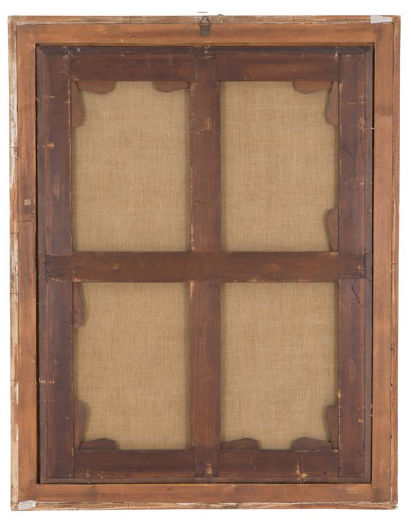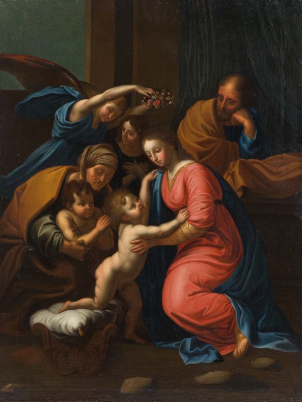Oil painting on canvas depicting "HOLY FAMILY WITH SAINT JOHN, SAINT ELIZABETH AND ANGELS". From Raphael. In a carved and gilded wooden frame. Already relined and reframed.