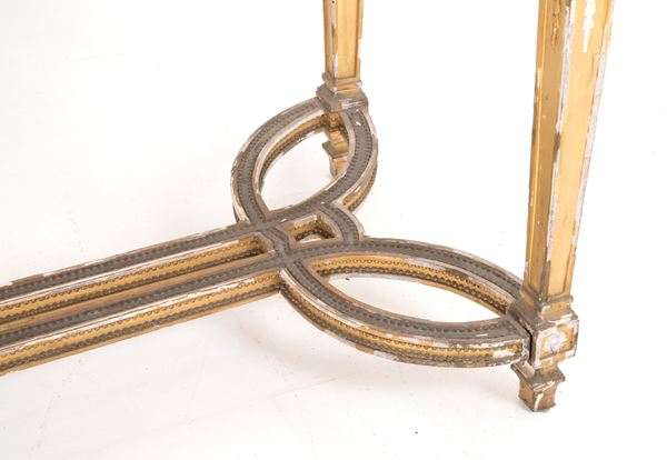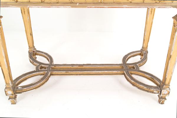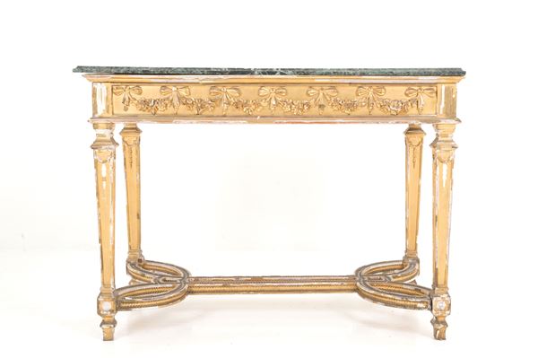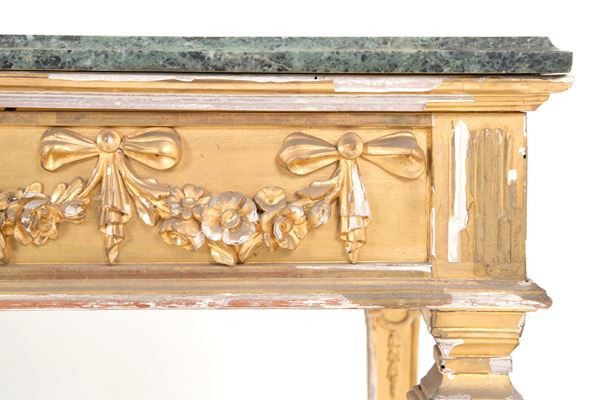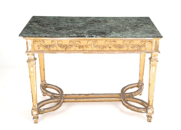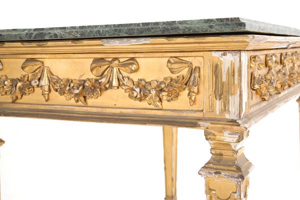 Center table in finely carved and gilded wood with green Alpi marble top. Production SOLEI HEBERT & C., NAPLES. Late 19th century. Defects.