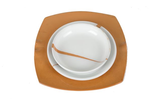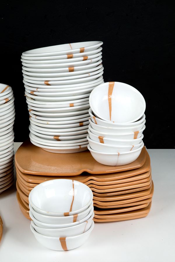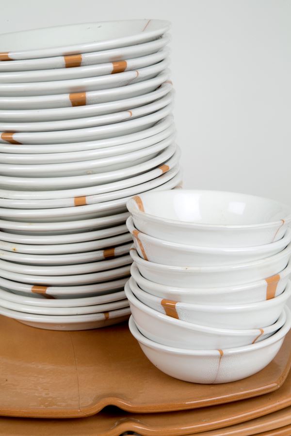 Incomplete table service in white ceramic with camel-colored decorations composed of twenty-seven dinner plates, eighteen soup plates, twenty-five fruit plates, thirteen camel-colored ceramic underplates (three of which are broken), thirteen cups, a bowl and two serving plates . CASTAGNA manufacturing. Defects.
