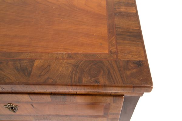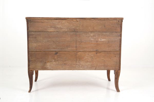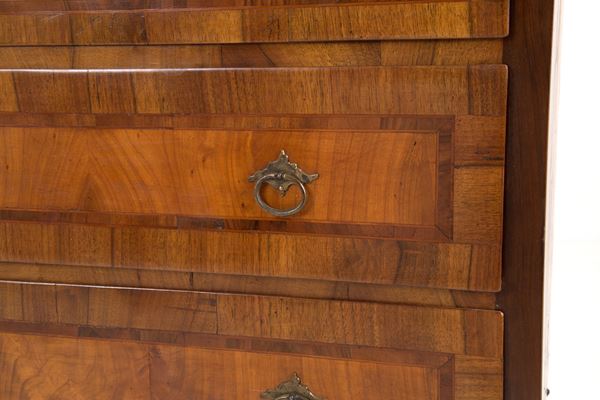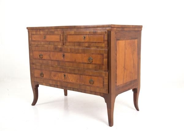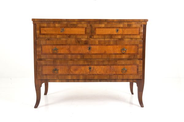 Chest of drawers with four drawers veneered in walnut and threaded in various woods with saber legs. 18th century.