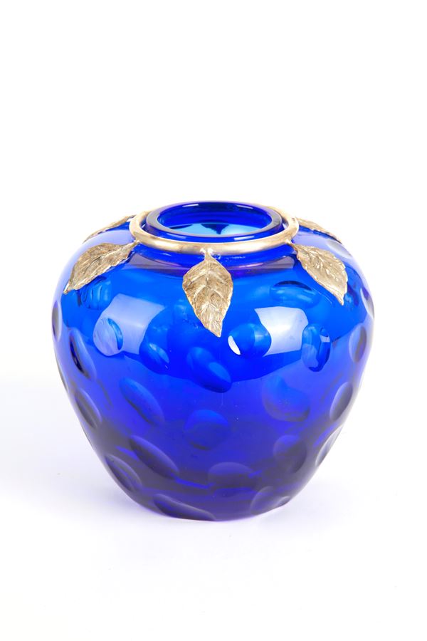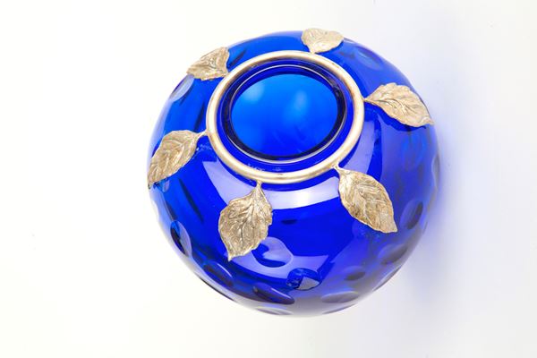 Cobalt blue glass vase with 800 silver leaf decorations. Signed on the base.