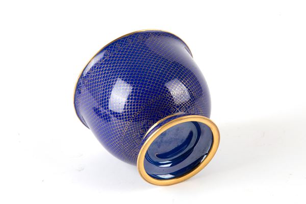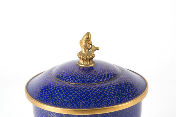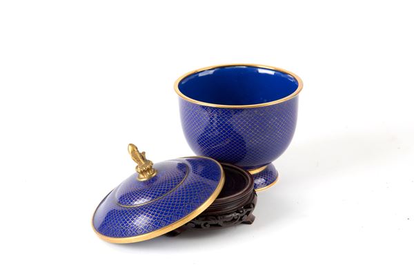 Blue porcelain cup with cloisonné decorations and lid with fish. Wooden base. 20th century.