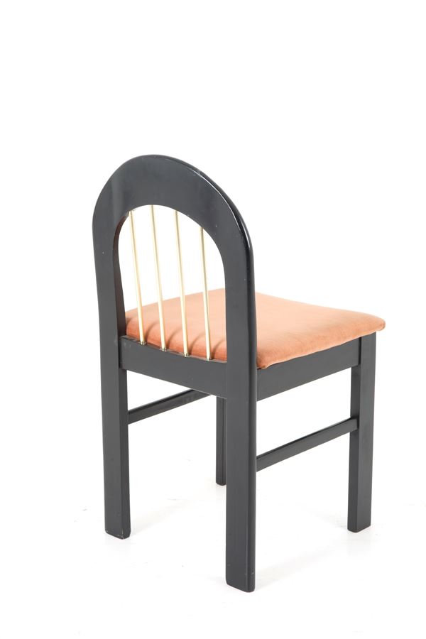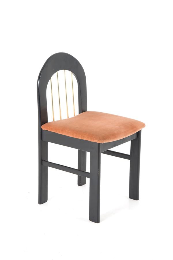 Six chairs in black lacquered wood and brass with brown velvet seats. 70's. Signs of wear and tear of time.