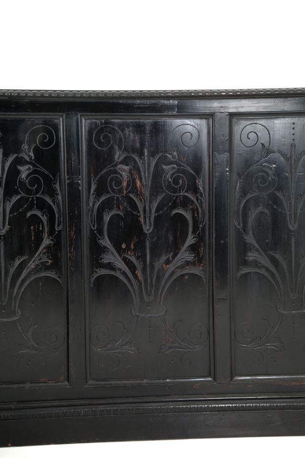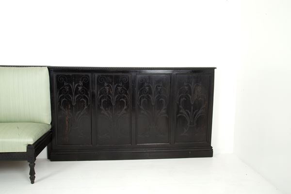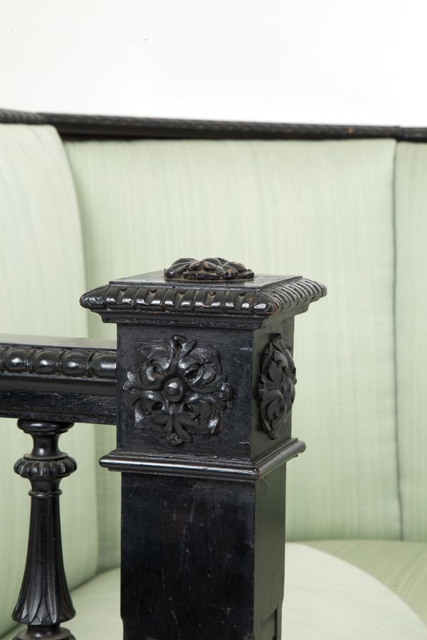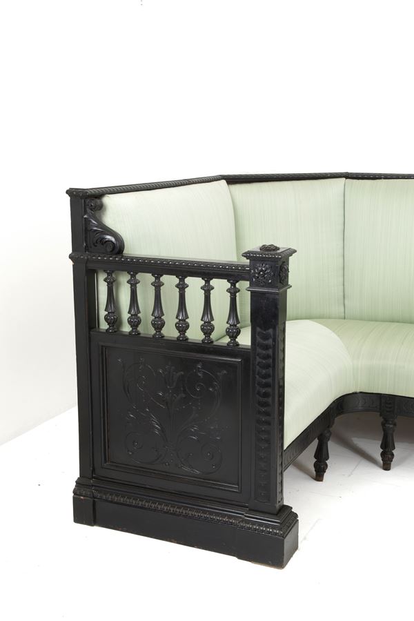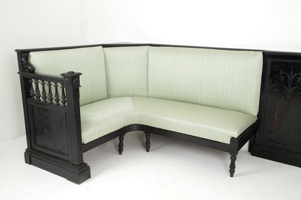 Corner sofa in ebonized wood carved with floral motifs with boiserie and padded silk seats. 20th century. Signs of wear over time.