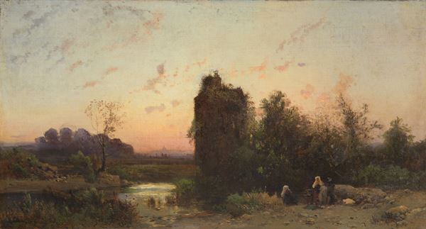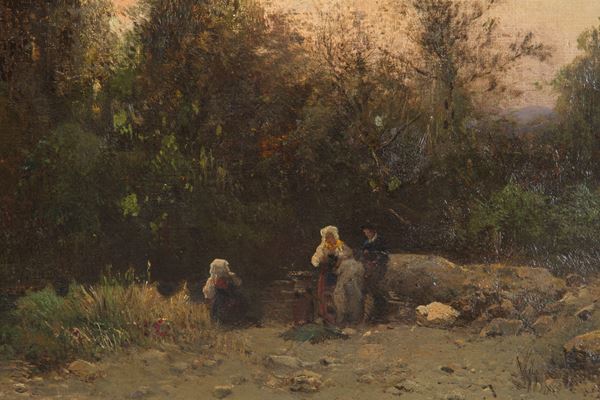 Oil painting on canvas depicting "RIVER LANDSCAPE WITH CHARACTERS". Signed lower left. In frame. Already relined and reframed. Restorations.