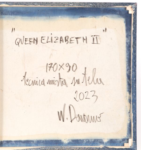 Mixed media on canvas entitled "QUEEN ELIZABETH II". Titled, signed and dated 2023 on the back. With authentication from the Agostino Art Gallery.