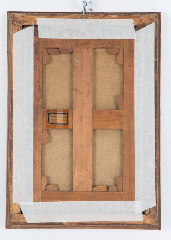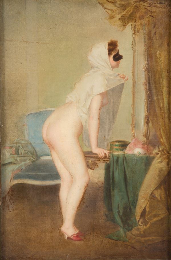 Oil painting on canvas entitled "FEMME AU MASQUE". Signed lower right. With cartouche on the back. In frame. Restorations.