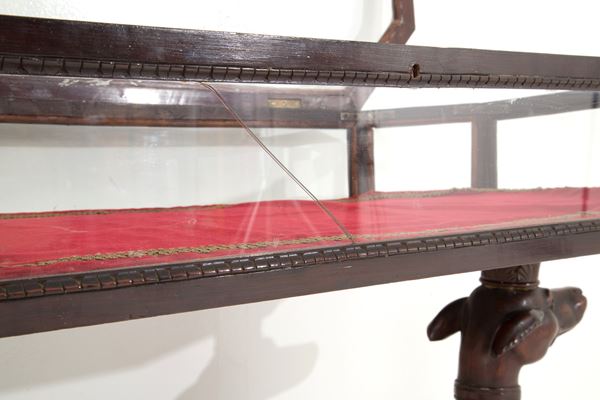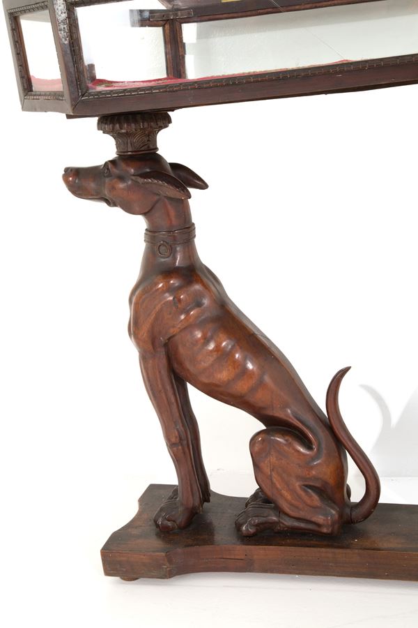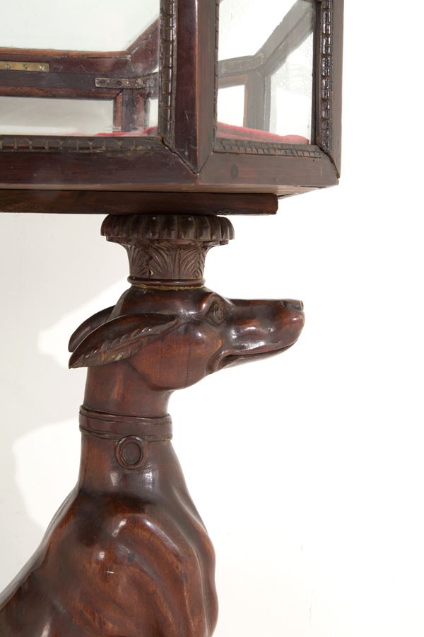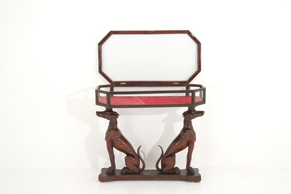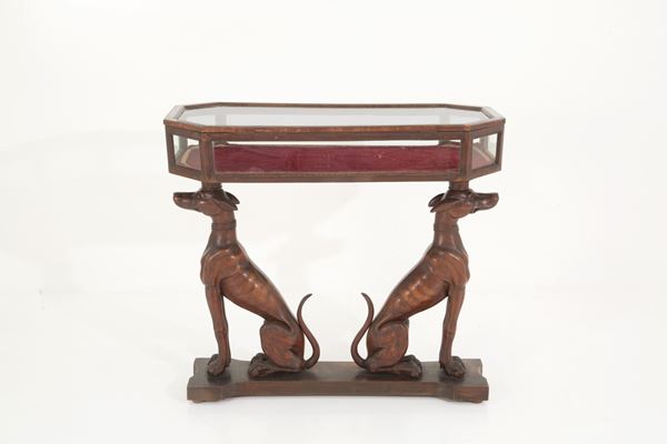Octagonal display case supported by a pair of mahogany sculptures depicting "GREYHOUNDERS". Late 19th century-early 20th century. Defects and breakages.