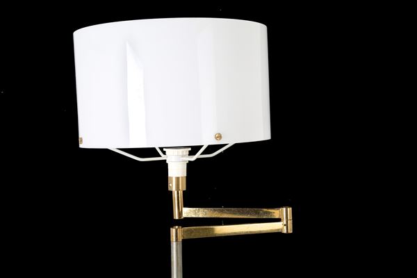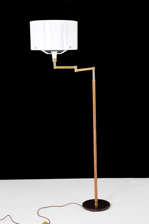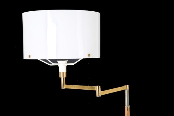 Floor lamp with extendable arm in iron, brass and plastic material. Stem covered in leather. 70's. Defects.