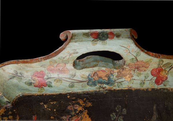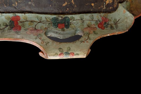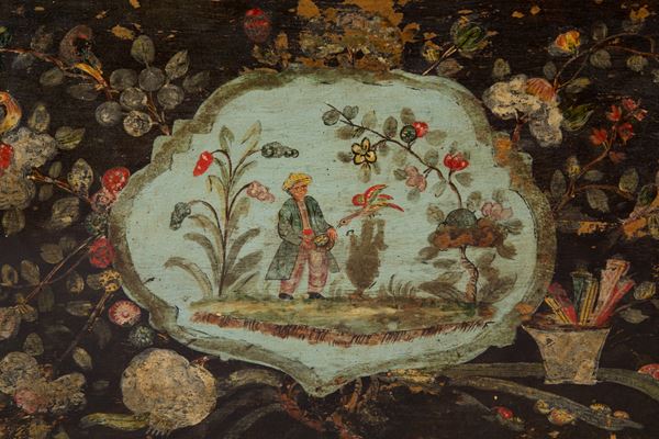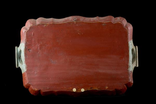 Lacquered wooden tray with floral motifs with a male figure in the centre. Venice. 18th century.