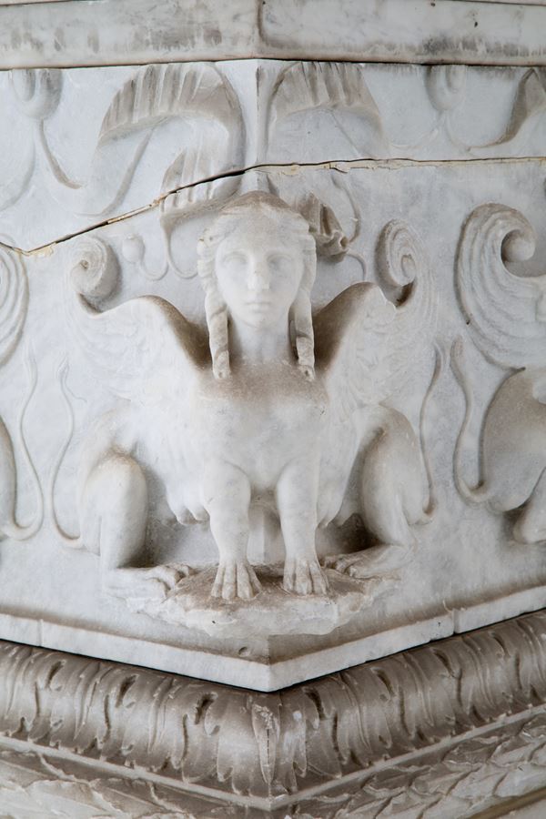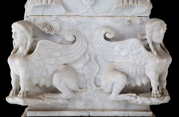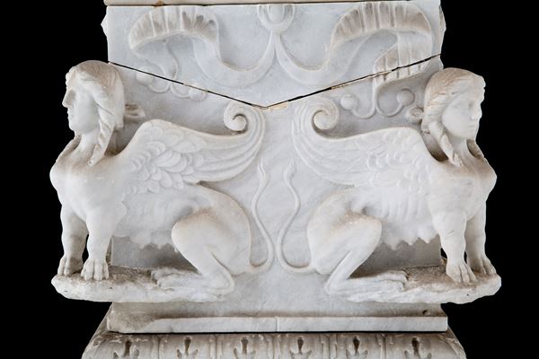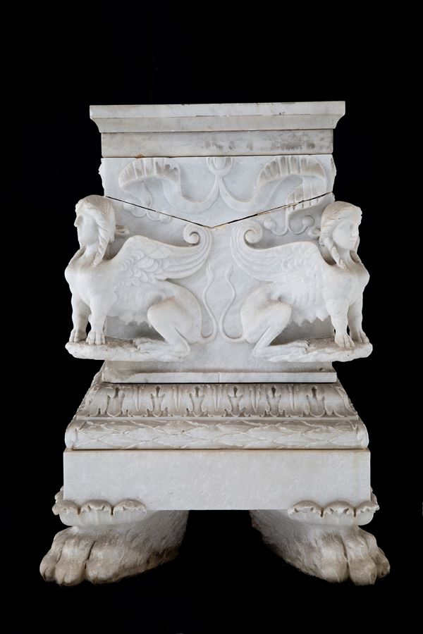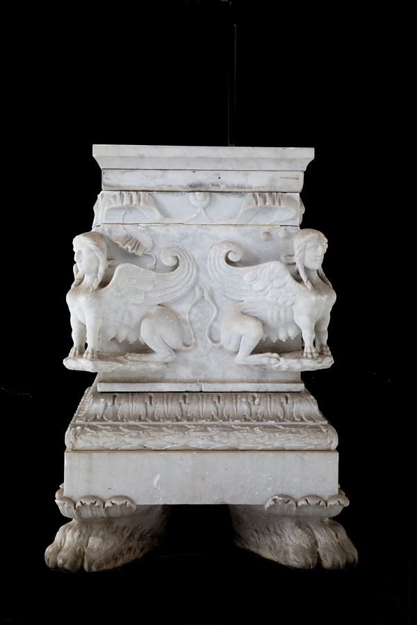White marble base carved with harpies and lion's feet. Late 19th century. Defects and slight shortcomings.
