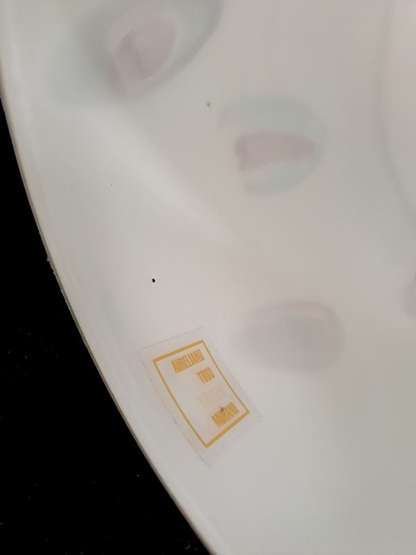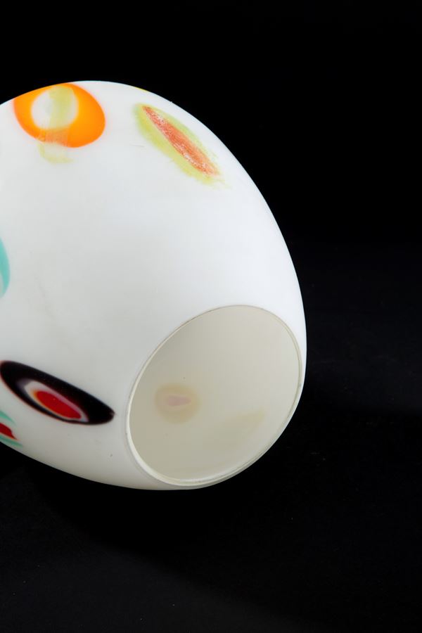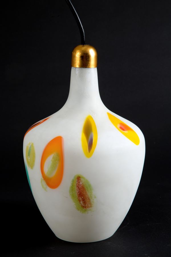 Chandelier in opaque milk glass with large murrine. Production AURELIANO TOSO. 1970s. With manufacturer's label.
