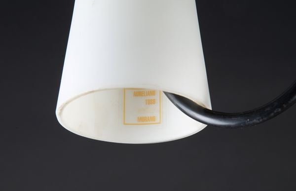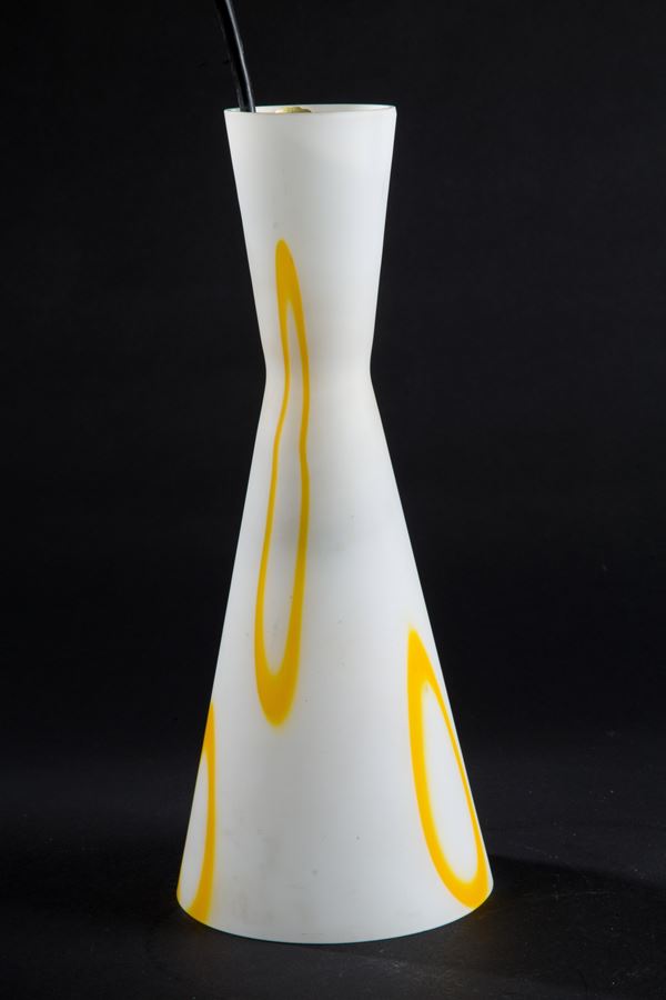 Opaque milk glass chandelier with large murrine. Glassworks production AURELIANO TOSO. 70s. With manufacturer's label inside.