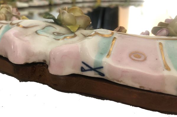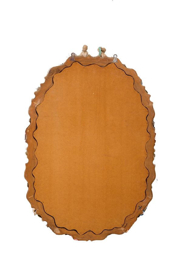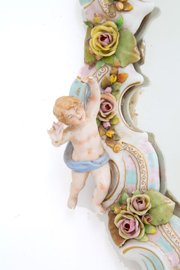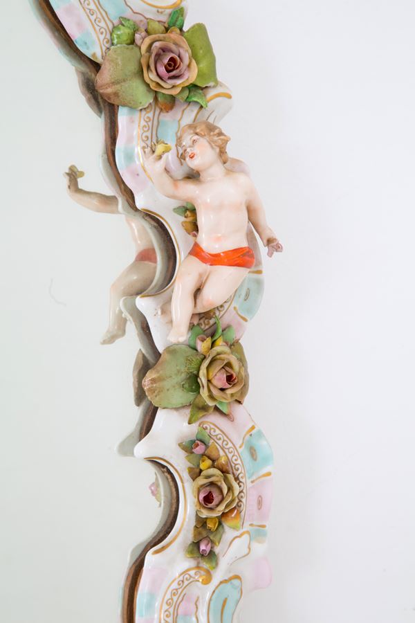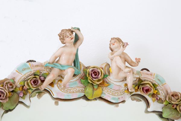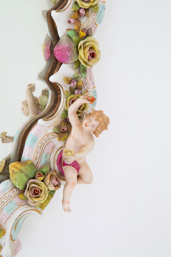 Mirror in polychrome Meissen porcelain with cherubs. Marked on the bottom. Early 20th century. Minor defects.
