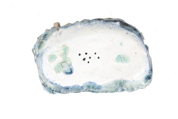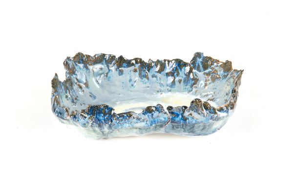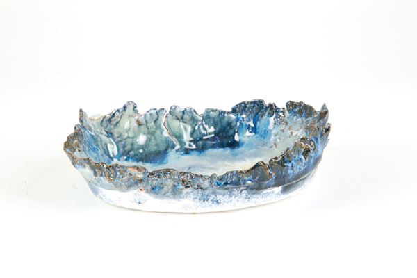 Glazed ceramic centerpiece in shades of blue.
