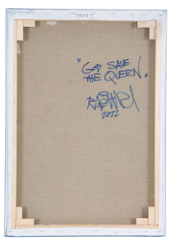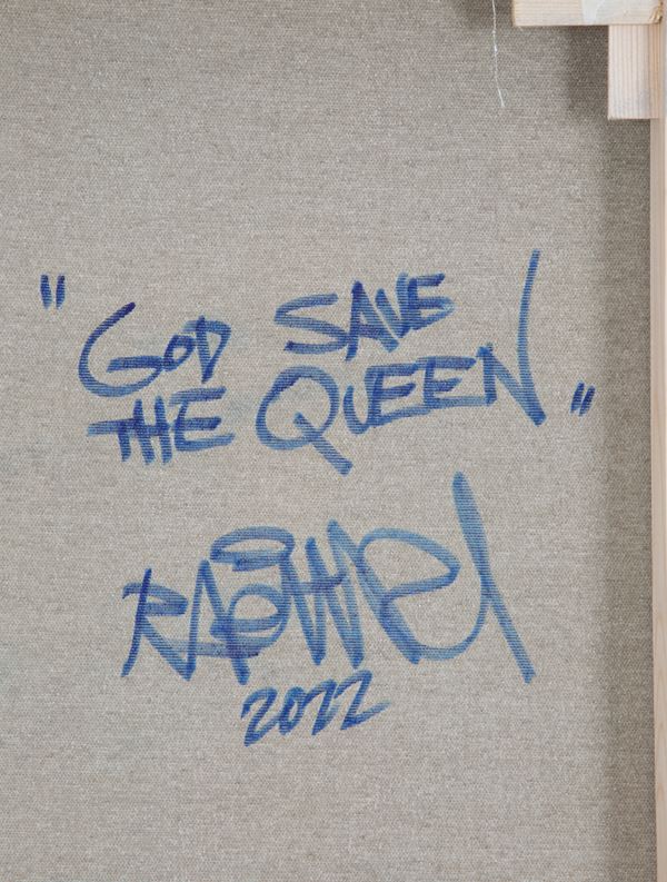 Spray painting on canvas, broken window technique, entitled "GOD SAVE THE QUEEN". Signed and dated 2022 lower right. Titled, countersigned and dated on the back. With artist's authentication.