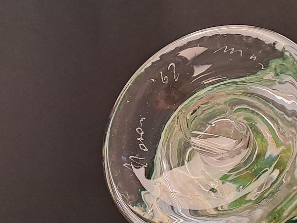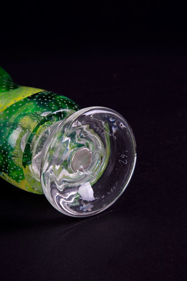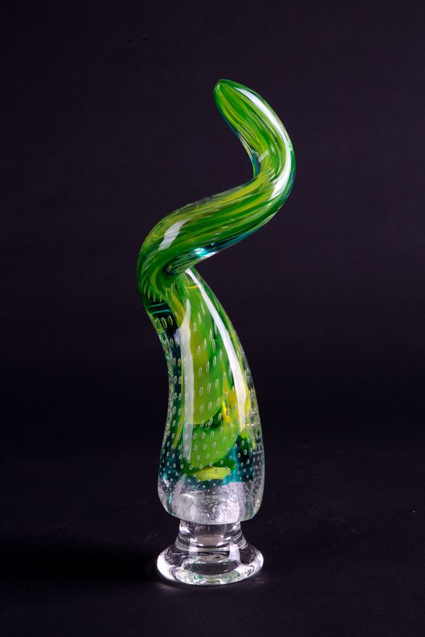 Glass sculpture in shades of green and yellow with bubbles in submersion. Signed and dated '62 on the bottom. Murano.