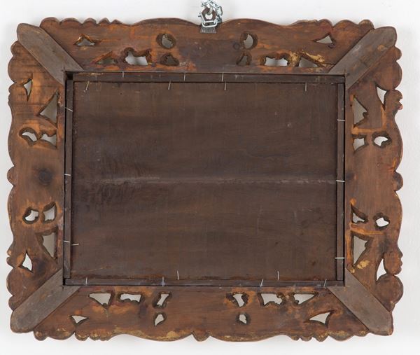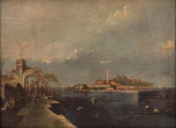 Oil painting on panel depicting "CAPRICCIO WITH ISLAND". Late 19th-early 20th century. In a carved and gilded frame.