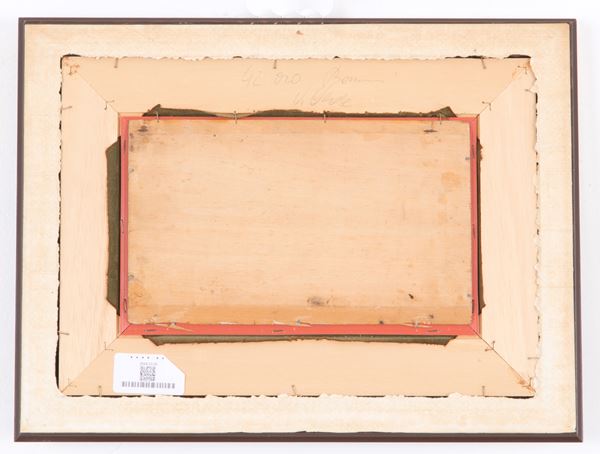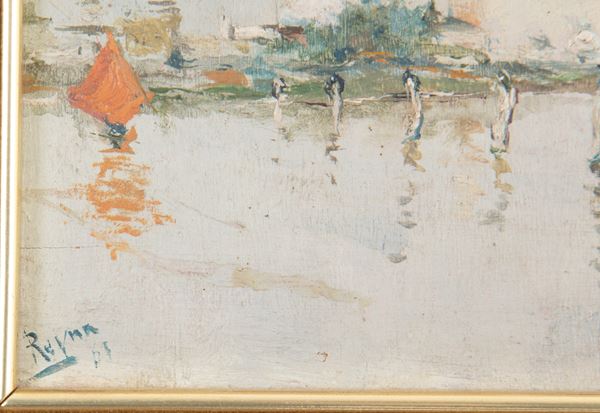 Oil painting on panel depicting "GONDOLA WITH FIGURES IN THE LAGOON". Signed REYNA and dated '61 lower left. In frame.