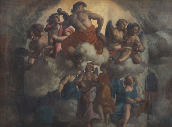 Oil painting on canvas depicting "MUSIC ANGELS". 17th century. In a lacquered and gilded frame. Defects and restorations. Already relined and reframed.