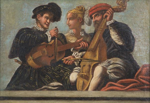 Oil painting on canvas depicting "MUSICANS". Late 17th century. In a lacquered and gilded frame. Defects and restorations. Already relined and reframed.