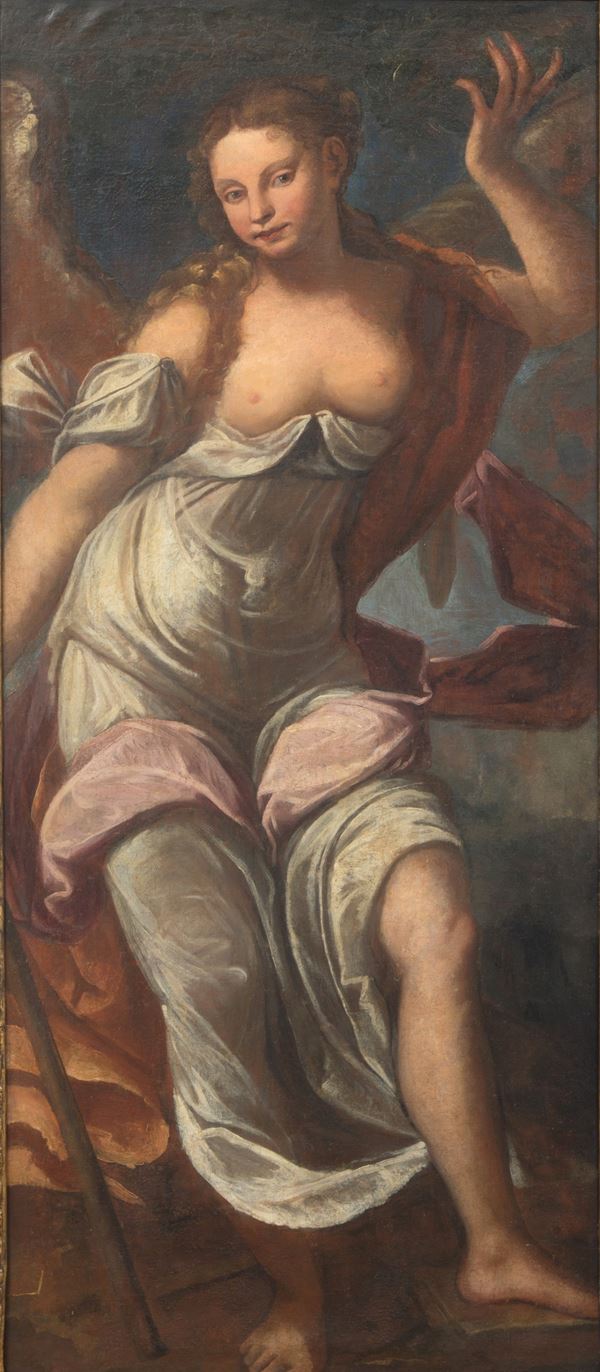 Oil painting on canvas depicting "WINGED WOMAN". Late 17th-early 18th century. In a carved and gilded frame. Defects and restorations. Already relined and reframed.