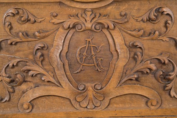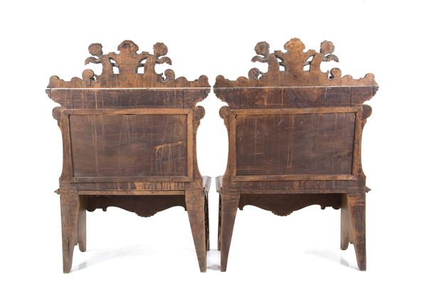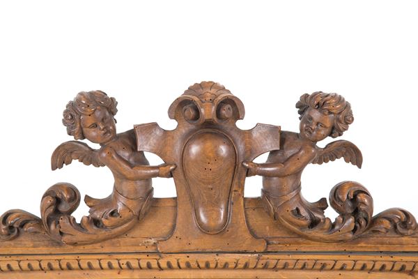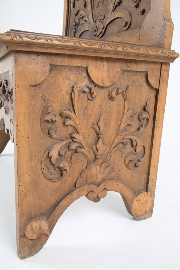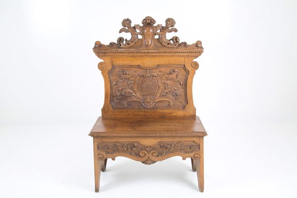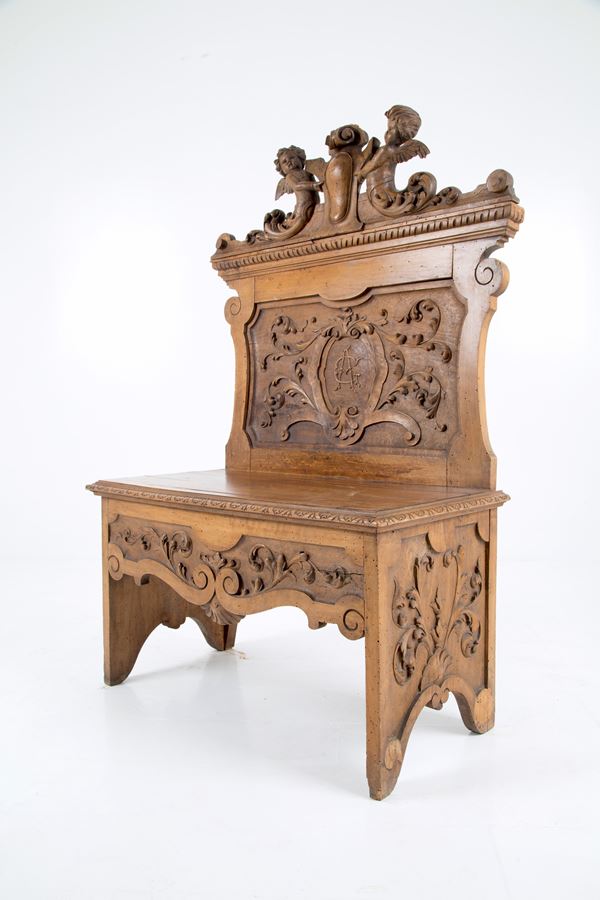 Pair of carved wooden benches with friezes in the shape of angels. Late 19th century.