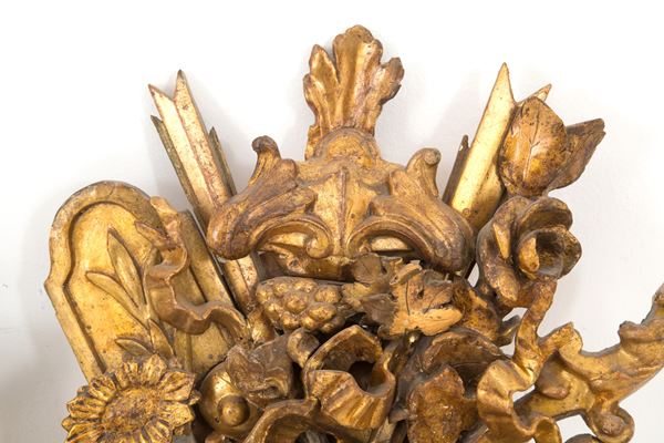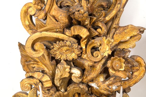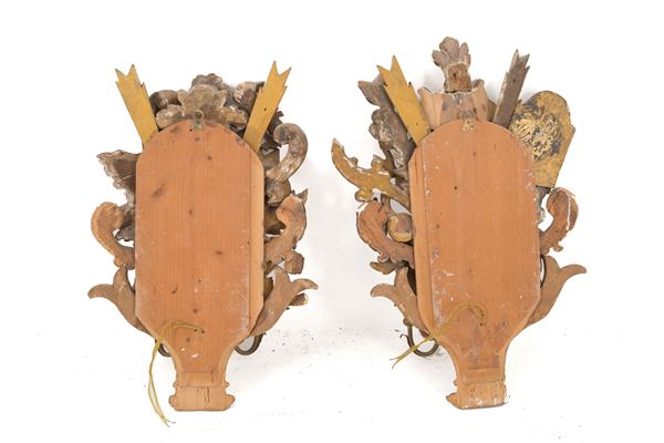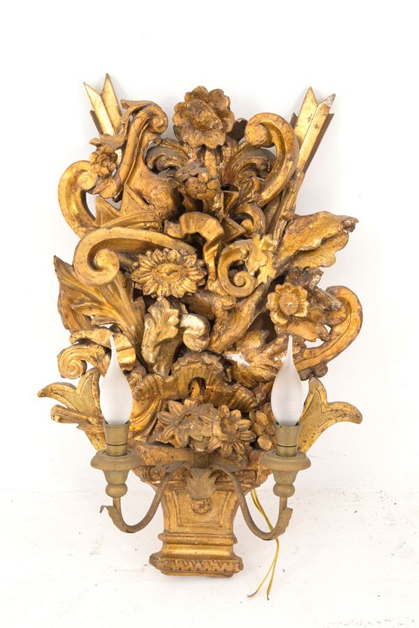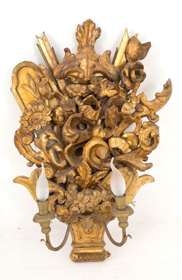 Pair of two-light wall sconces in wood carved with floral and gilded motifs. 19th century. Defects and shortcomings.