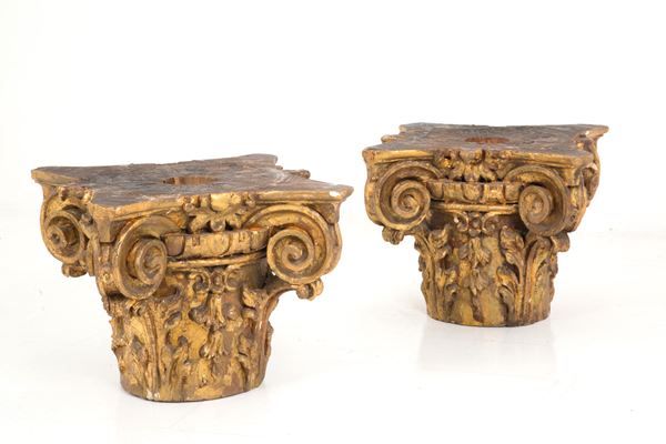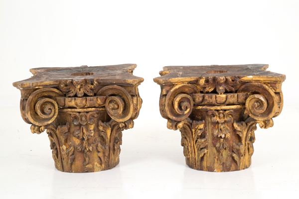 Pair of carved and gilded wooden capitals. 17th century. Defects.