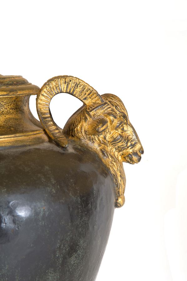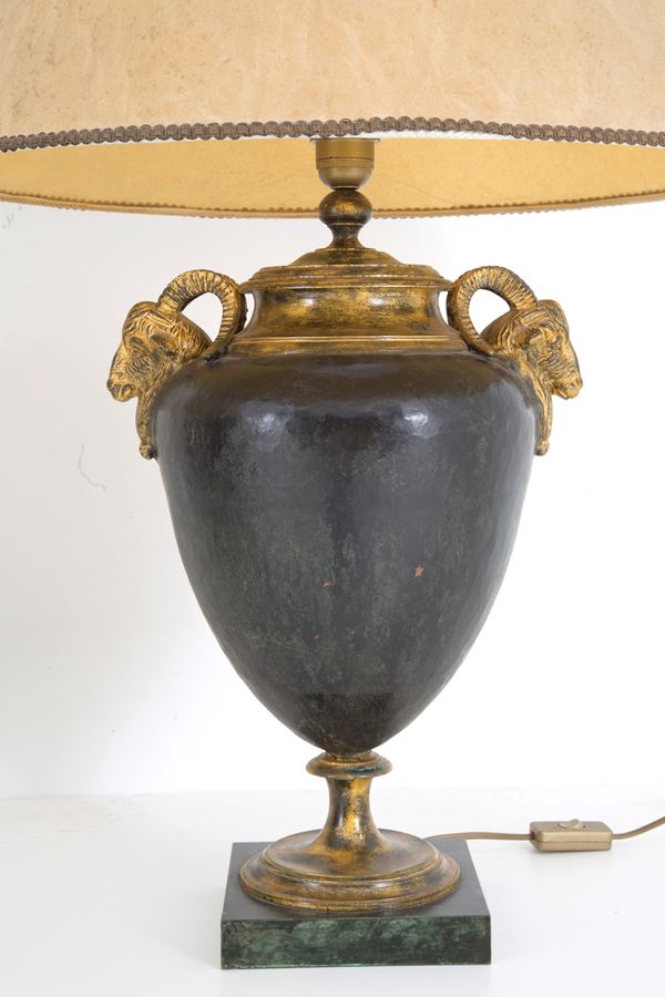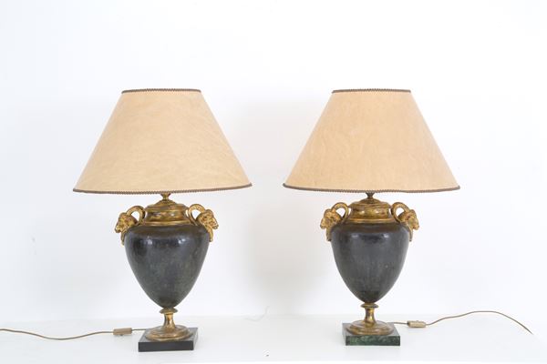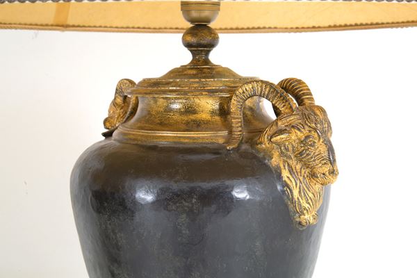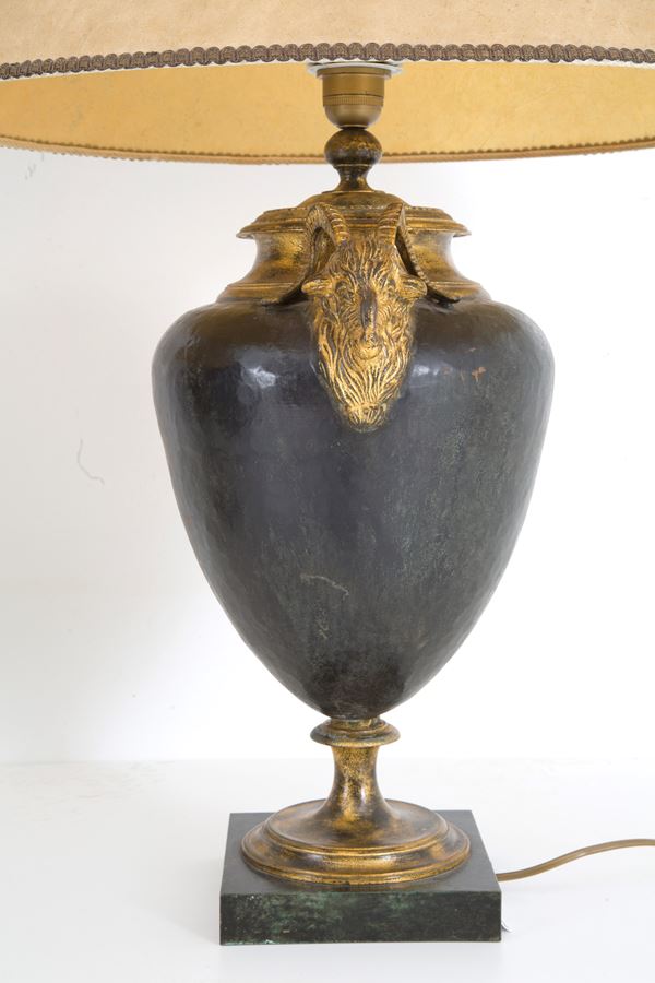 Pair of burnished and gilded bronze lamps with goat heads on the sides and parchment lampshades. Early 20th century.