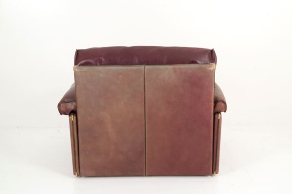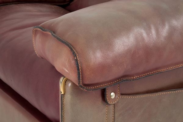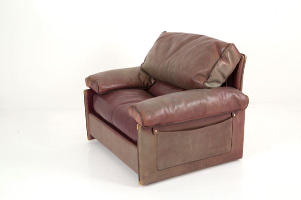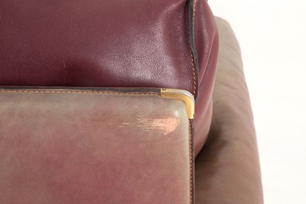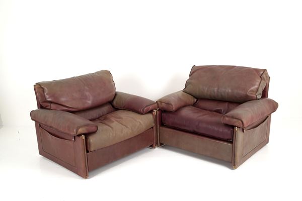 Pair of metal armchairs, padded bull leather and brass finishes with side pockets. 80s. Defects and signs of wear and tear over time.