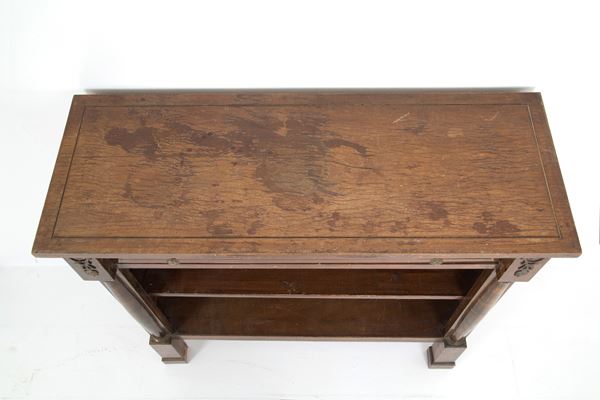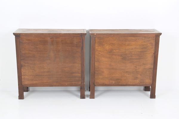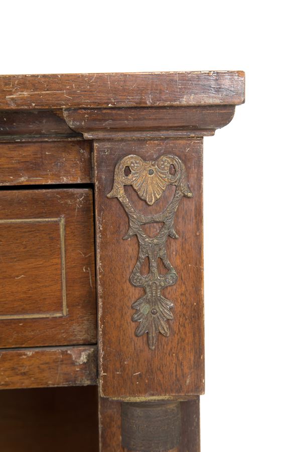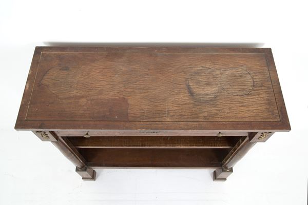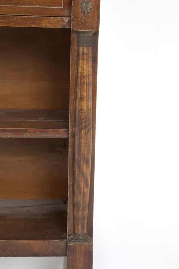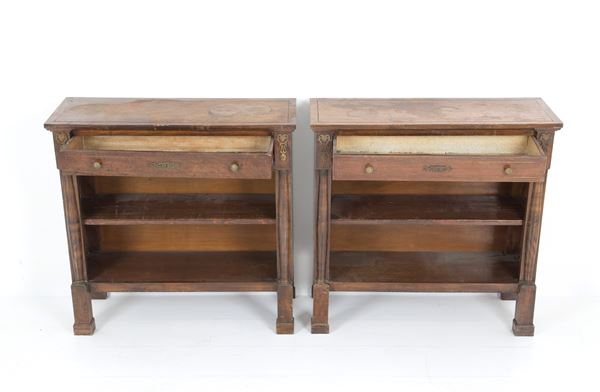Pair of small bookcases in veneered wood and threaded in brass with lateral columns. Late 19th century. Defects.