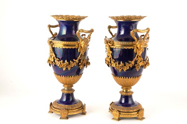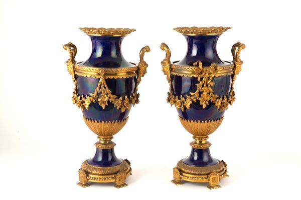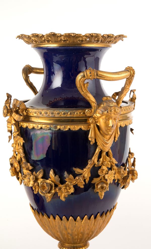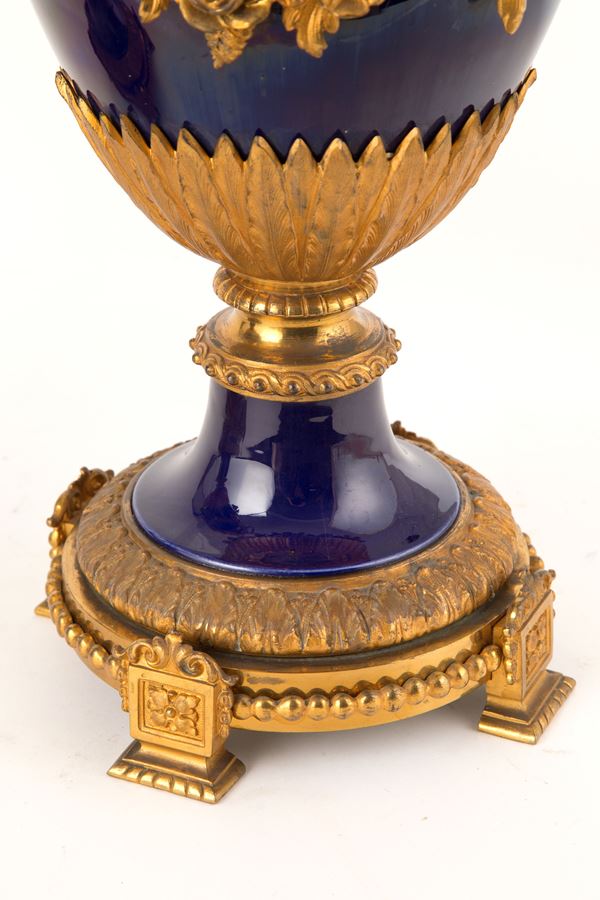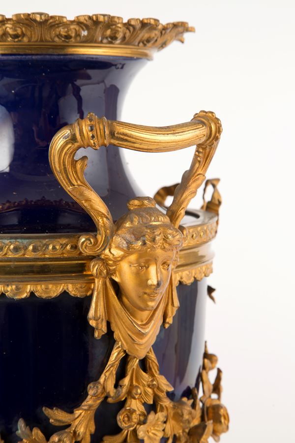 Pair of cobalt blue ceramic vases with finely chiseled and gilded bronzes. France. 19th century.