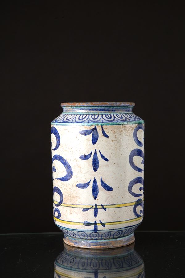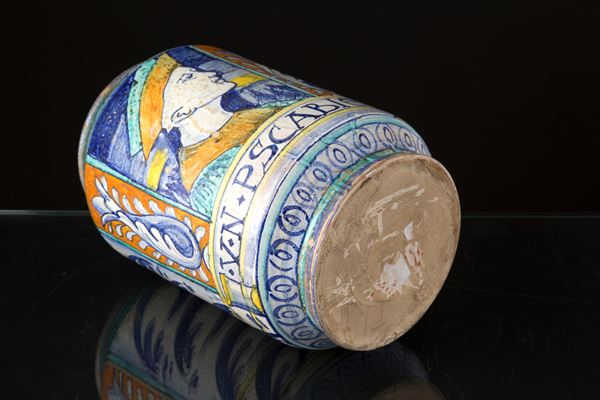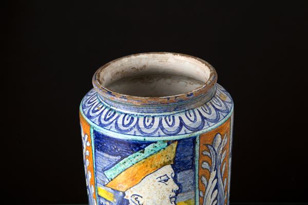 Polychrome ceramic pharmacy vase decorated with portrait. Faenza. Late 16th century. Slight defects.