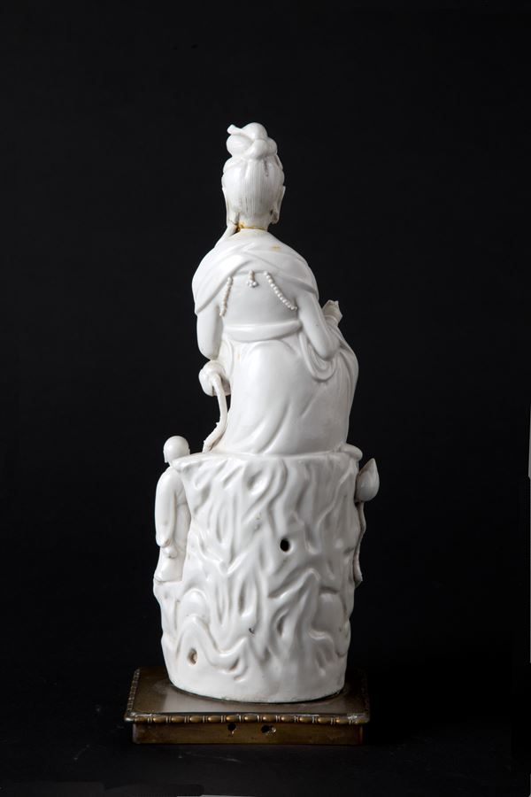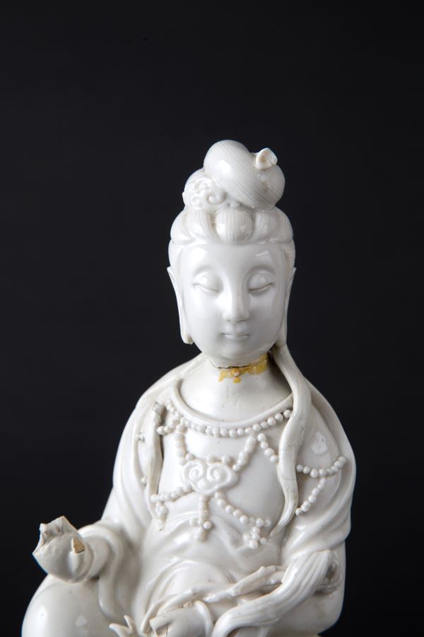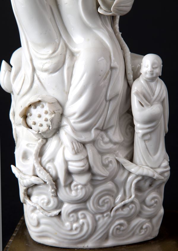 White porcelain sculpture depicting "DEITY". Wooden base. China. Late 19th century. Defects and breakages.
