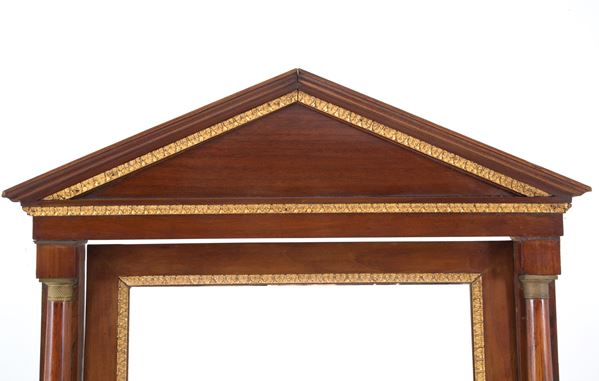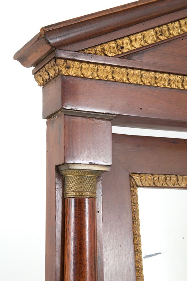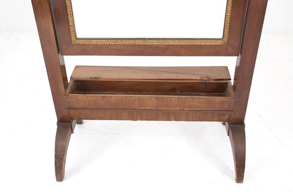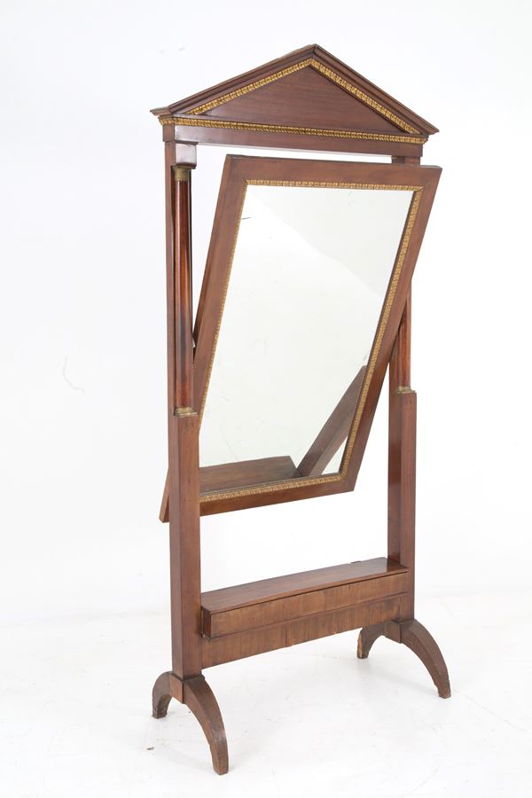 Psyche veneered in mahogany with gilding, tilting mirror and a flap compartment in the lower part. Empire period. Defects.